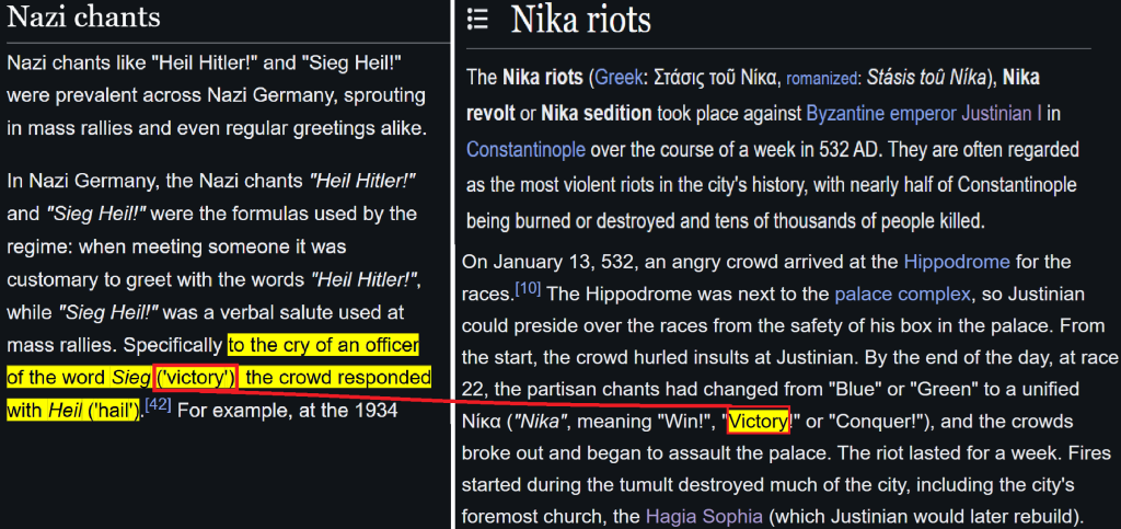 Is it a coincidence, that Hitler and his National Socialists developed their own chant that involved the word Victory being repeated over and over? in German “Sieg”, but also a response with “Heil”. A rough English translation would be “VICTORY!”, “YES!”. Was it a coincidence, or were they preparing the way for the Emperor? In any case, if an Emperor ever does become established, and the people have their monthly temper tantrum, then they might be careful to begin any chants of Nika; because the Emperor’s loyalists will now have a chant response of their own to match and reply with; leveling the playing field. And with a level playing field, the Emperor will always win, because…