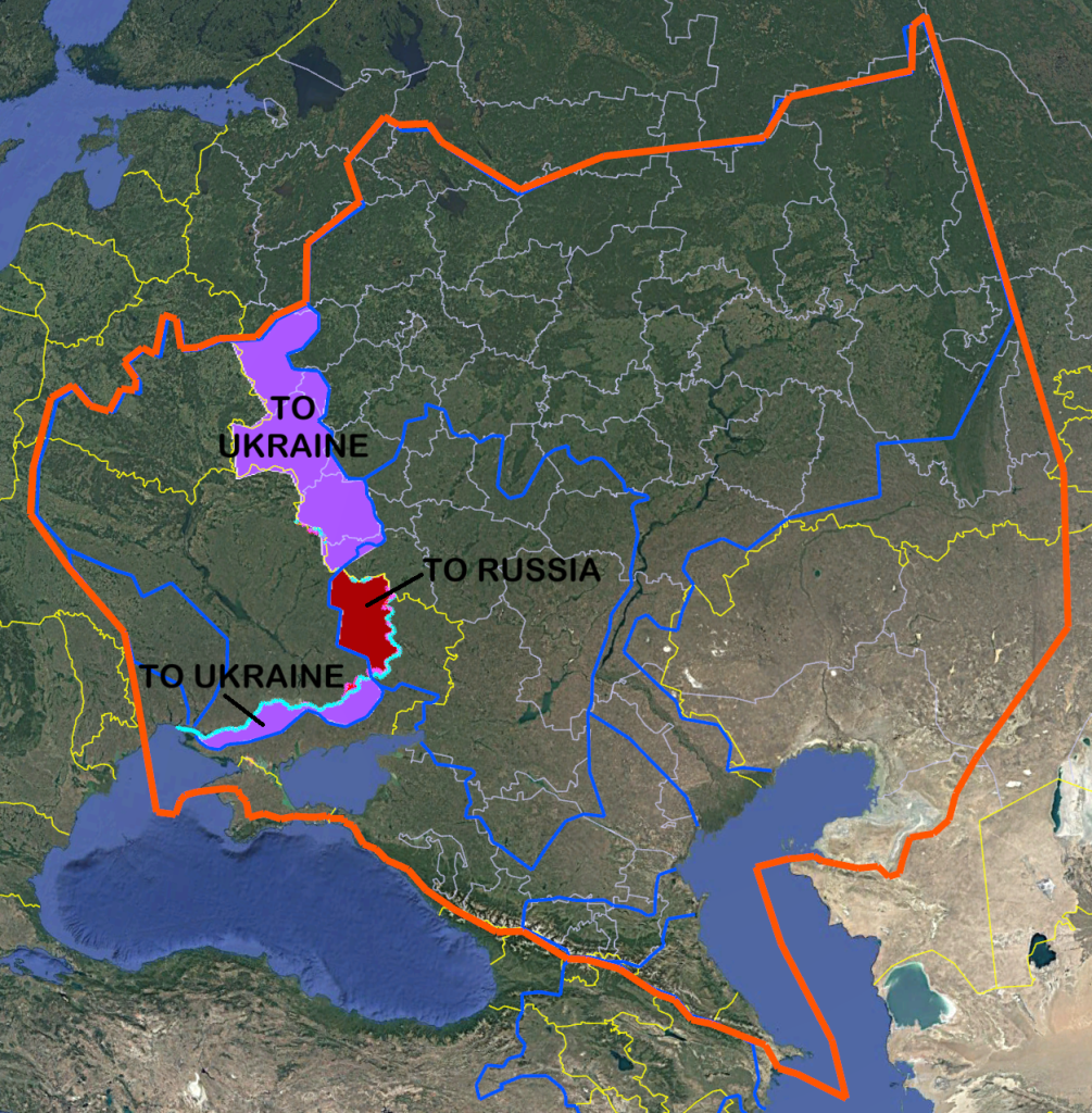 I imagine this orange border as encompassing the entirety of the homeland of the Slavic race. If these are 2 tribes of the Slavic race at war, then I could see their division along the Dneiper, Don, and Volga basins. Considering Belarus as a puppet nation of Russia to be dissolved at some future date, which could see Ukraine collecting the entirety of their Dneiper basin. And even if Russia really is some Asian puppet state, still if they were to be freed later on, it would train the common folk to accept these basin boundaries in the meantime. It also seems like a fairly equal land trade if you consider Russia keeping Crimea and most of the lands it has already seized from Ukraine; which absolutely cannot be released by Russia or else their common folk would rebel against their leaders for sending their soldiers to die for land that was not even kept. And the Ukrainians would receive solace in the lives of their own soldiers lost by receiving a very significant piece of Russia.