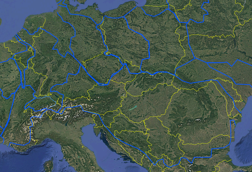 Take a look at the major river basins in central Europe. The border between France and Germany along the Rhine river showcases the intense long term hostility between France and Germany which has seen back and forth war in this region for thousands of years. Switzerland has great borders situated primarily along the Aare river basin even while part of the Rhine River still Switzerland is a culturally German state; and Italy also along the river basins bordered at the Alps mountains, this signifies highly stable relations with their neighbors. Meanwhile Germany and France seem to have unsettled conflicts. These conclusions are obvious either by a simple viewing of the river basins compared to borders, or by an advanced study of history.