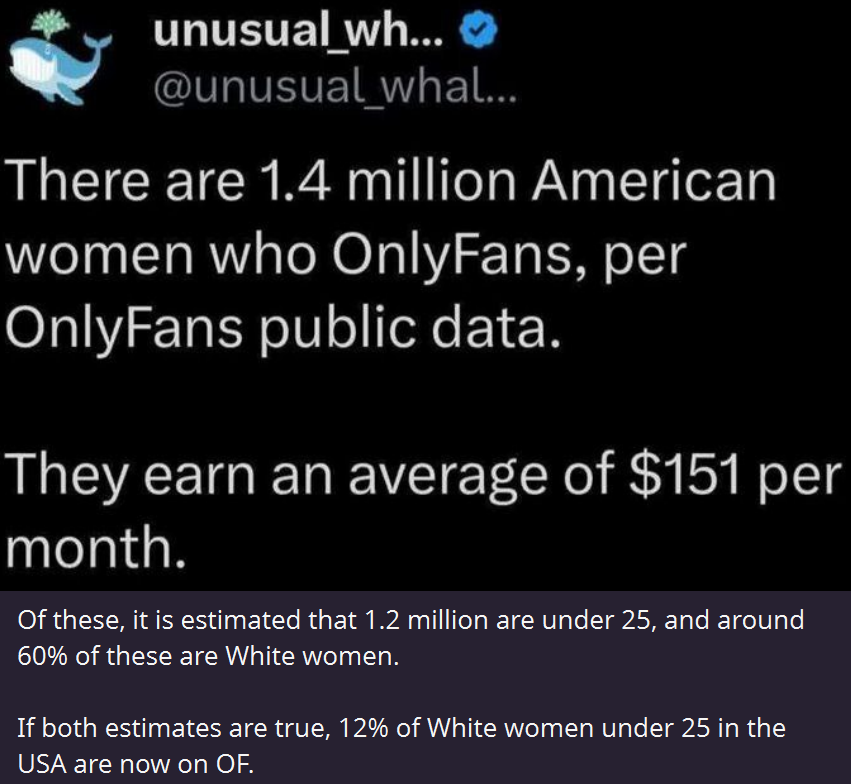 – 12% of white women under 25 are now internet prostitutes.